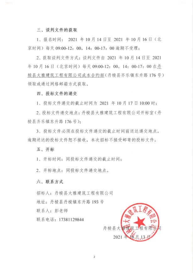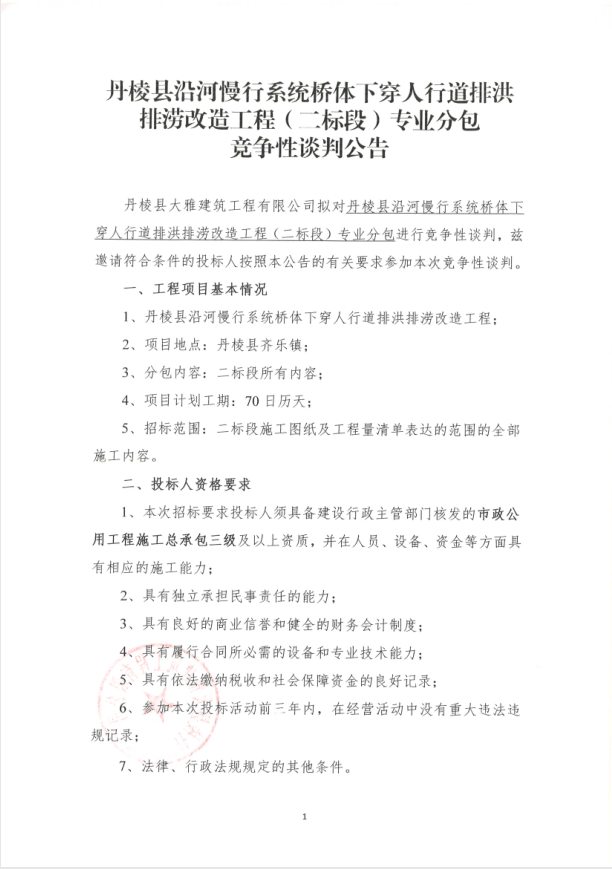 【大雅建筑公司】丹棱縣沿河慢行系統(tǒng)橋體下穿人行道排洪排澇改造工程(二標(biāo)段)專業(yè)分包競爭性談判公告