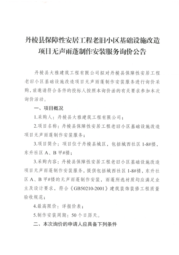 【大雅建筑公司】丹棱縣保障性安居工程老舊小區(qū)基礎(chǔ)設(shè)施改造項目無聲雨蓬制作安裝服務(wù)詢價公告