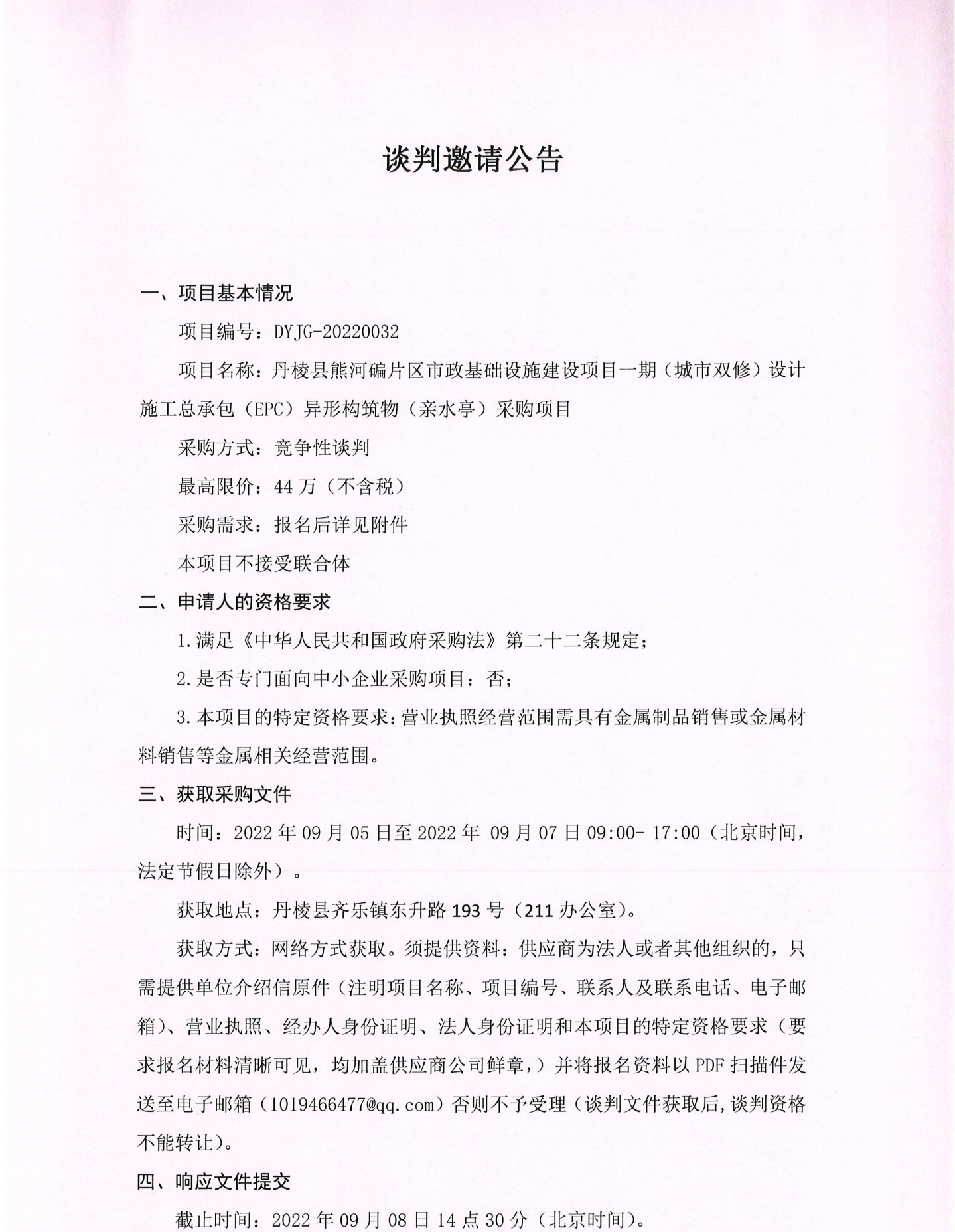 丹棱縣熊河碥片區(qū)市政基礎(chǔ)設(shè)施建設(shè)項目一期(城市雙修)設(shè)計施工總承包(EPC)異形構(gòu)筑物(親水亭)采購項目談判邀請公告