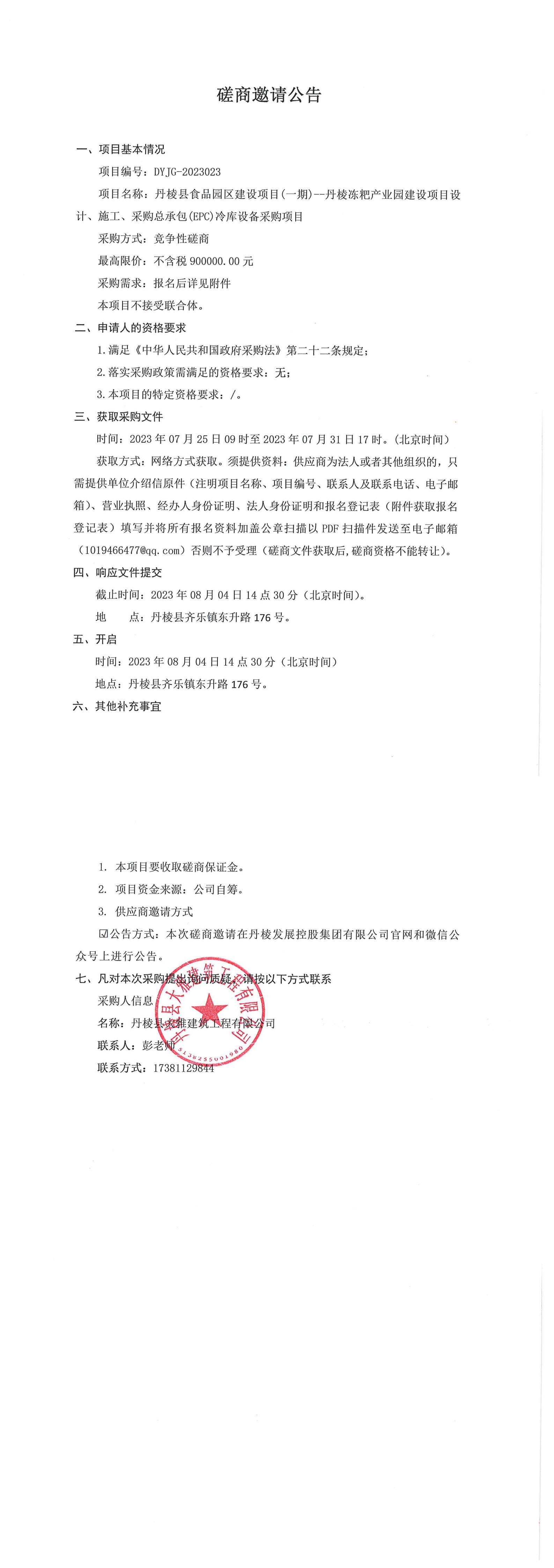 丹棱縣食品園區(qū)建設(shè)項(xiàng)目(一期)--丹棱凍粑產(chǎn)業(yè)園建設(shè)項(xiàng)目設(shè)計(jì)、施工、采購(gòu)總承包(EPC)冷庫(kù)設(shè)備采購(gòu)項(xiàng)目磋商邀請(qǐng)公告