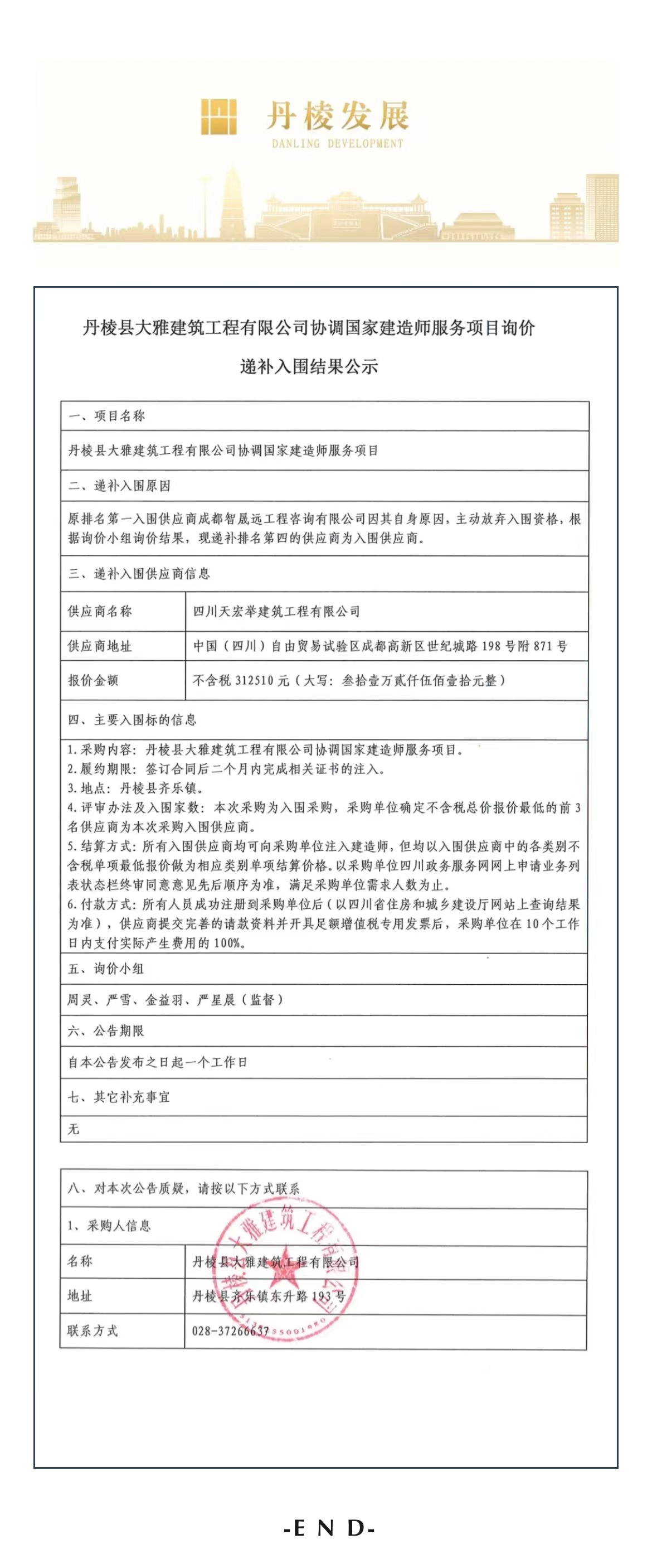 丹棱縣大雅建筑工程有限公司協(xié)調(diào)國家建造師服務(wù)項(xiàng)目詢價遞補(bǔ)入圍結(jié)果公示