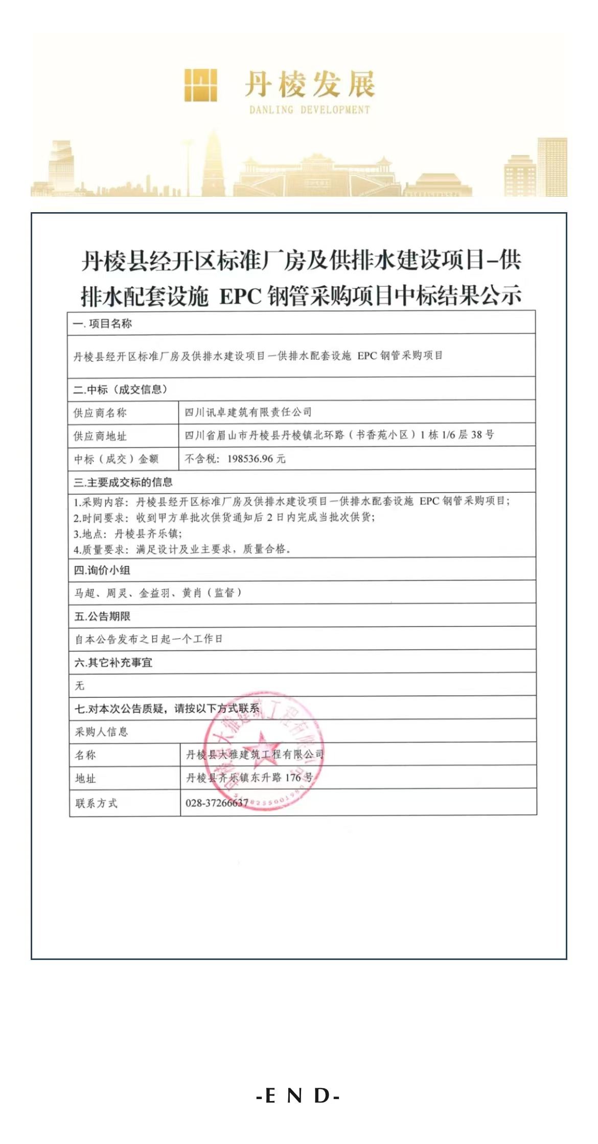 丹棱縣經(jīng)開區(qū)標準廠房及供排水建設項目——供排水配套設施EPC鋼管采購項目中標結(jié)果公示