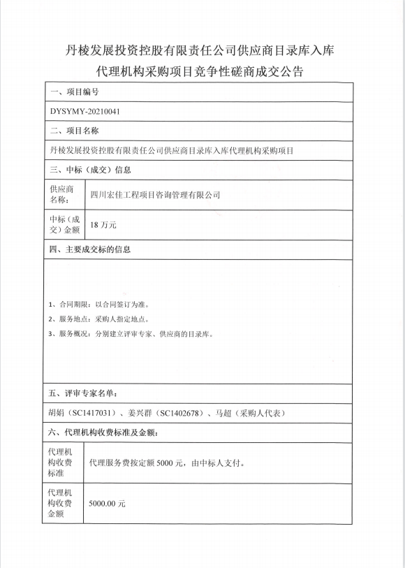 【丹發(fā)展公司】丹棱發(fā)展投資控股有限責(zé)任公司供應(yīng)商目錄庫入庫代理機(jī)構(gòu)采購項(xiàng)目競(jìng)爭(zhēng)性磋商成交公告