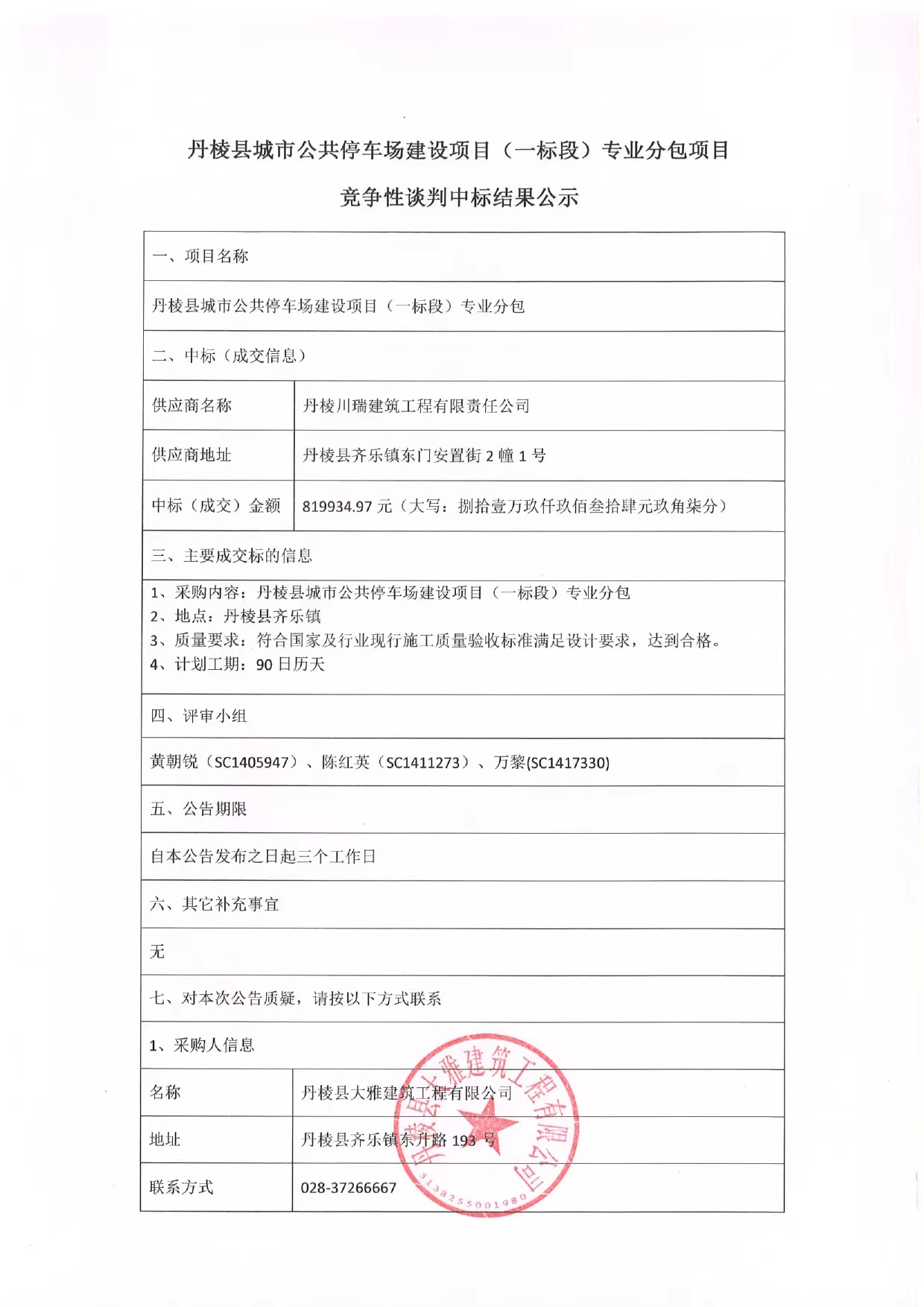 丹棱縣城市公共停車場建設(shè)項目(一標(biāo)段)專業(yè)分包項目競爭性談判中標(biāo)結(jié)果公示
