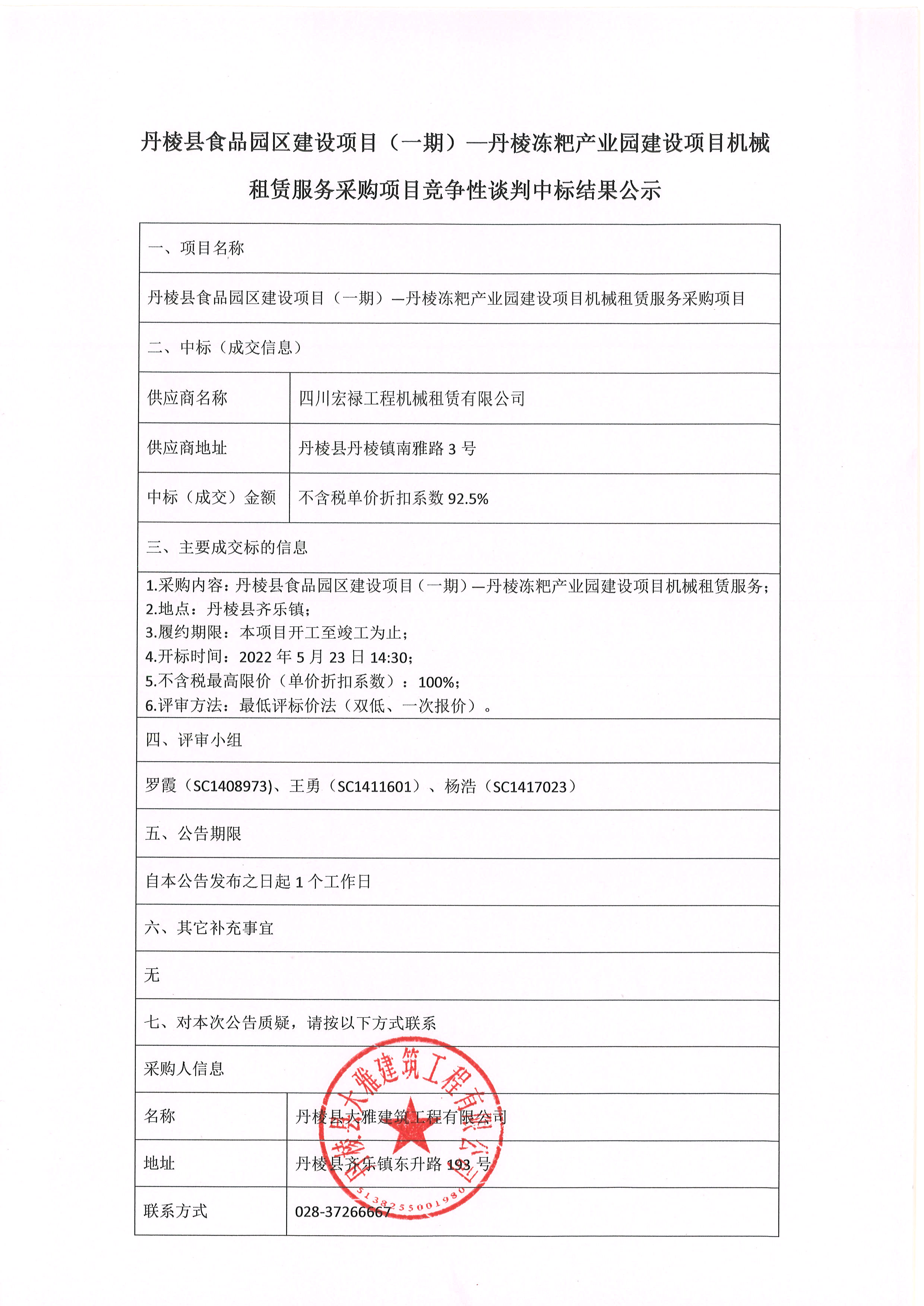 丹棱縣食品園區(qū)建設(shè)項目(一期)-丹棱凍粑產(chǎn)業(yè)園建設(shè)項目機械 租賃服務(wù)采購項目競爭性談判中標結(jié)果公示