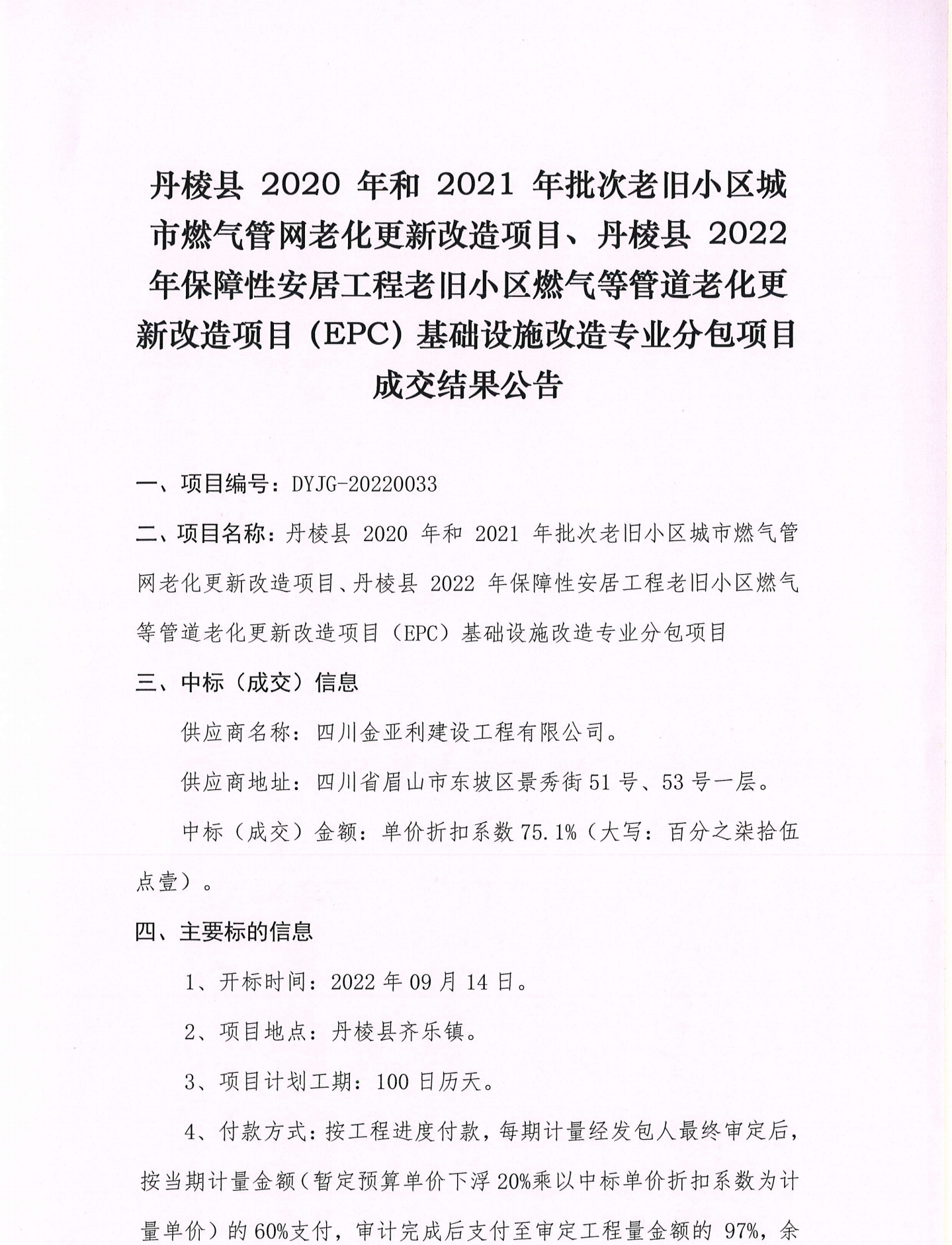 丹棱縣2020年和2021年批次老舊小區(qū)城市燃氣管網(wǎng)老化更新改造項目、丹棱縣2022年保障性安居工程老舊小區(qū)燃氣等管道老化更新改造項目(EPC)基礎設施改造專業(yè)分包項目 成交結果公告
