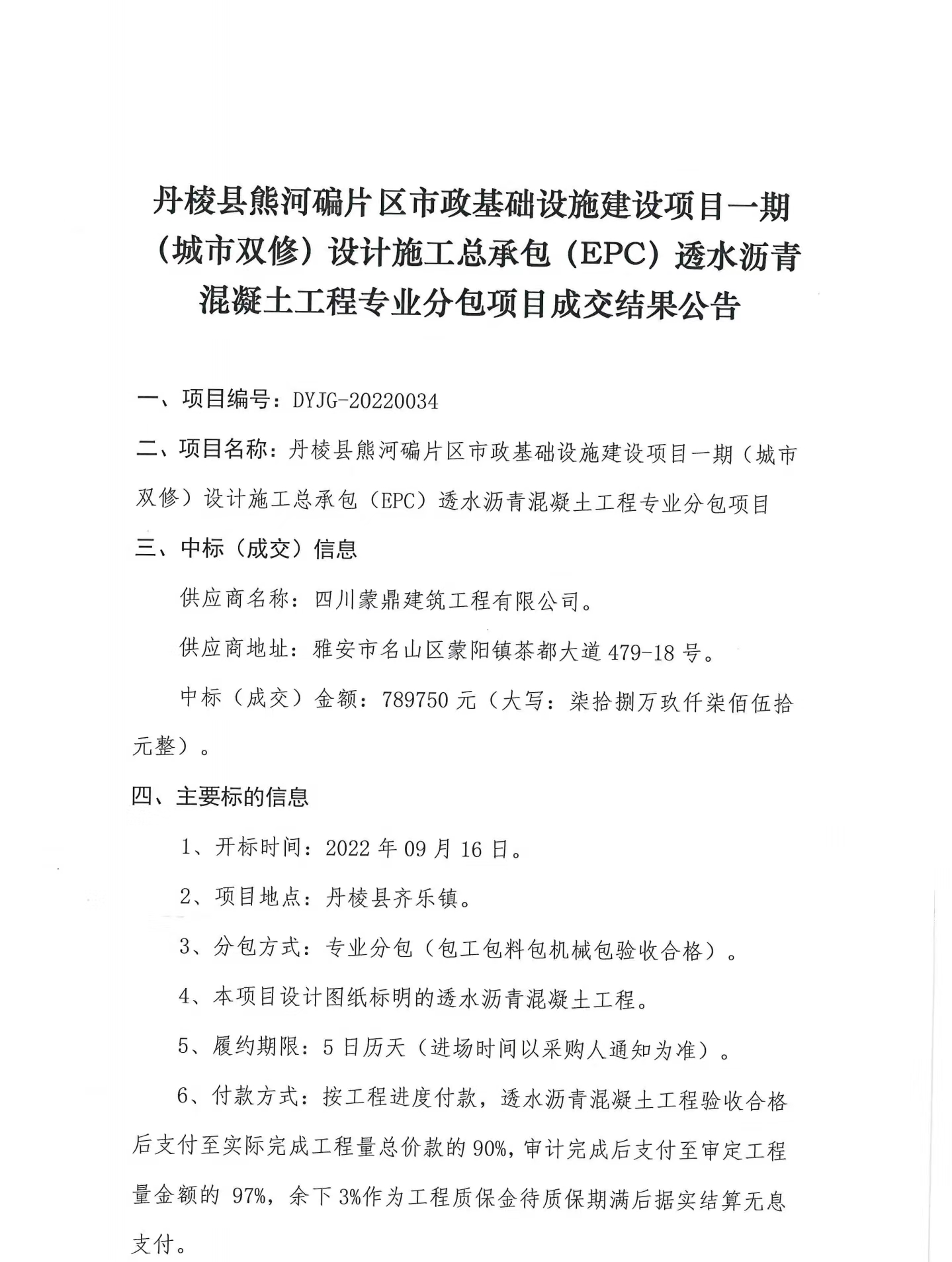 丹棱縣熊河碥片區(qū)市政基礎設施建設項目一期(城市雙修)設計施工總承包(EPC)透水瀝青混凝土工程專業(yè)分包項目成交結果公告