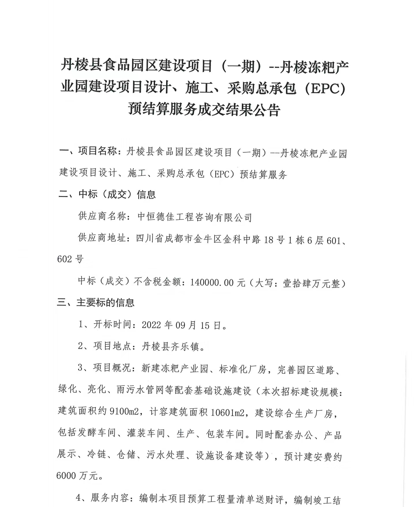 丹棱縣食品園區(qū)建設項目(一期)--丹棱凍粑產業(yè)園建設項目設計、施工、采購總承包(EPC)預結算服務成交結果公告