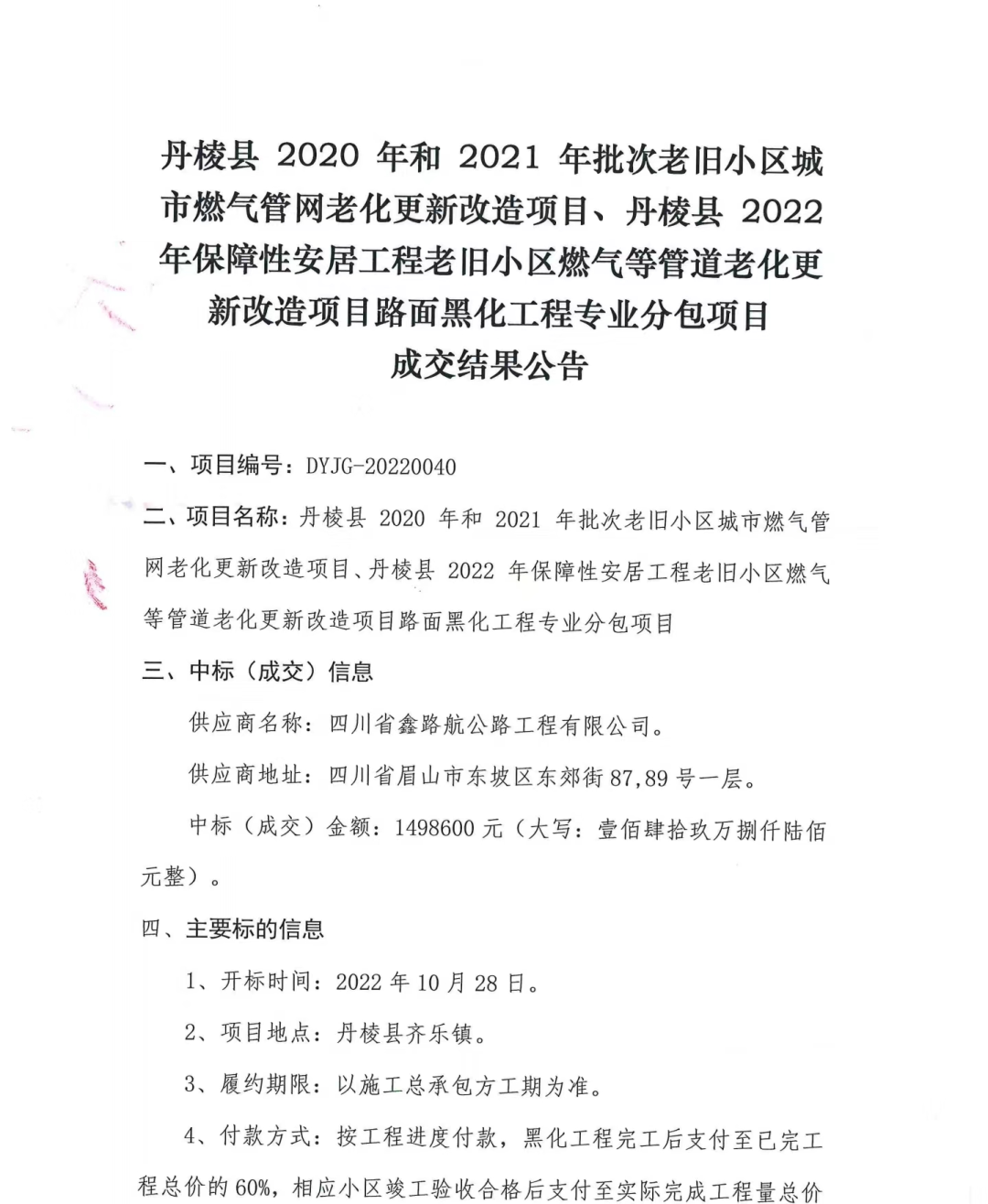 丹棱縣2020年、2021年、2022年保障性安居工程老舊小區(qū)燃氣等管道老化更新改造項目路面黑化工程專業(yè)分包項目成交結(jié)果公告