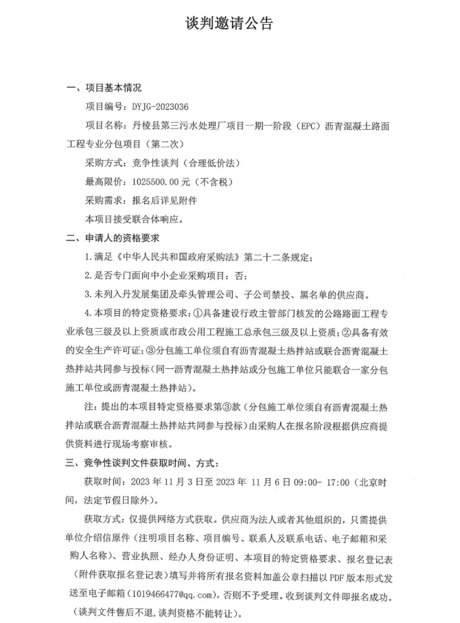 丹棱縣第三污水處理廠項(xiàng)目一期一階段(EPC)瀝青混凝土路面工程專(zhuān)業(yè)分包項(xiàng)目(第二次)談判邀請(qǐng)公告