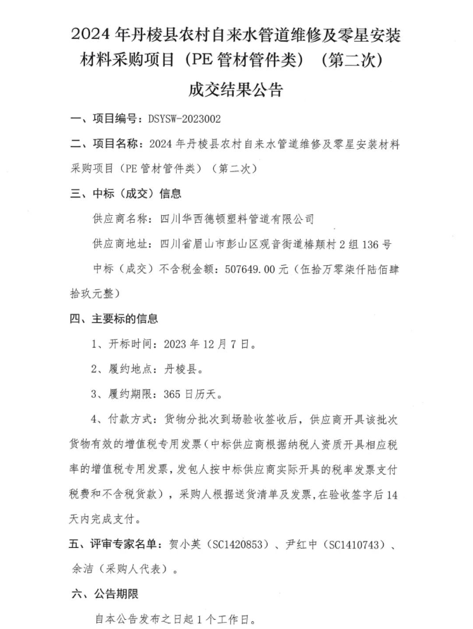 2024年丹棱縣農(nóng)村自來水管道維修及零星安裝材料采購項(xiàng)目(PE管材管件類)(第二次)成交結(jié)果公告