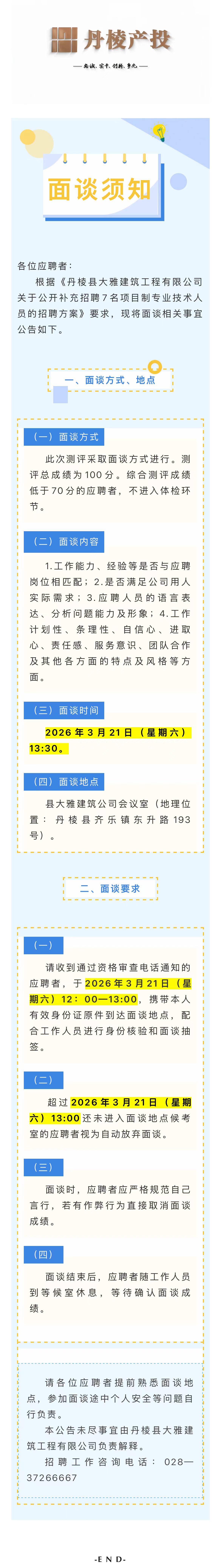 丹棱縣大雅建筑工程有限公司關(guān)于公開補充招聘7名項目制專業(yè)技術(shù)人員的面談須知