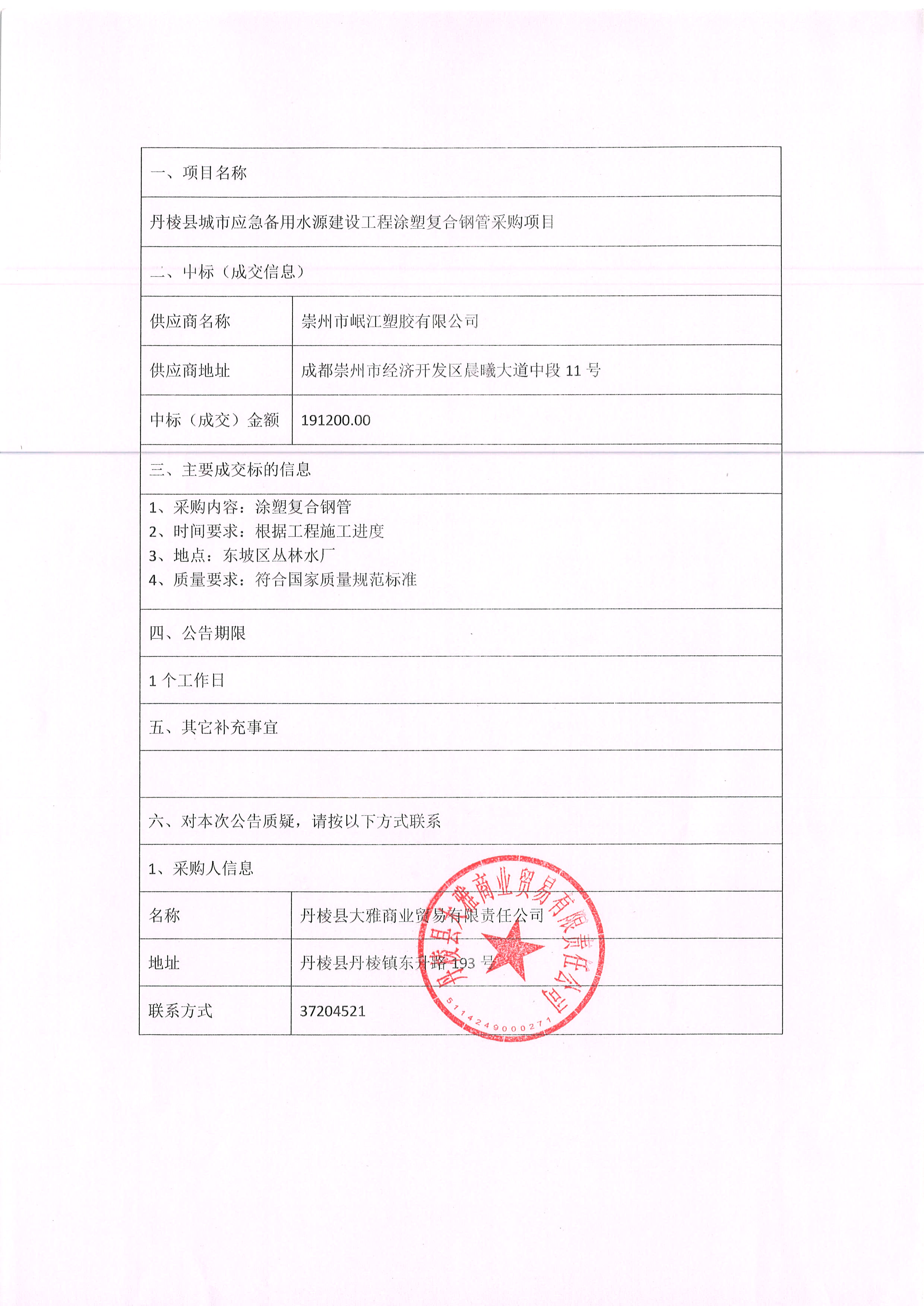 【大雅商貿(mào)公司】丹棱縣城市應急備用水源建設工程涂塑復合鋼管采購項目中標結(jié)果公示