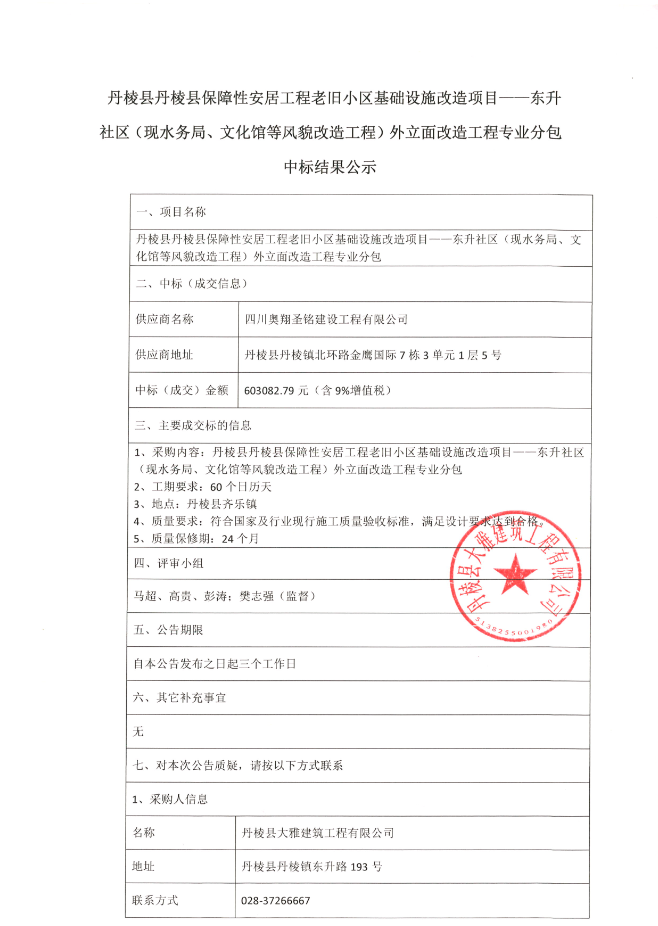 【大雅建筑公司】丹棱縣保障性安居工程老舊小區(qū)基礎(chǔ)設(shè)施改造項(xiàng)目--東升社區(qū)(現(xiàn)水務(wù)局、文化館等風(fēng)貌改造工程)外立面改造工程專業(yè)分包中標(biāo)結(jié)果公示