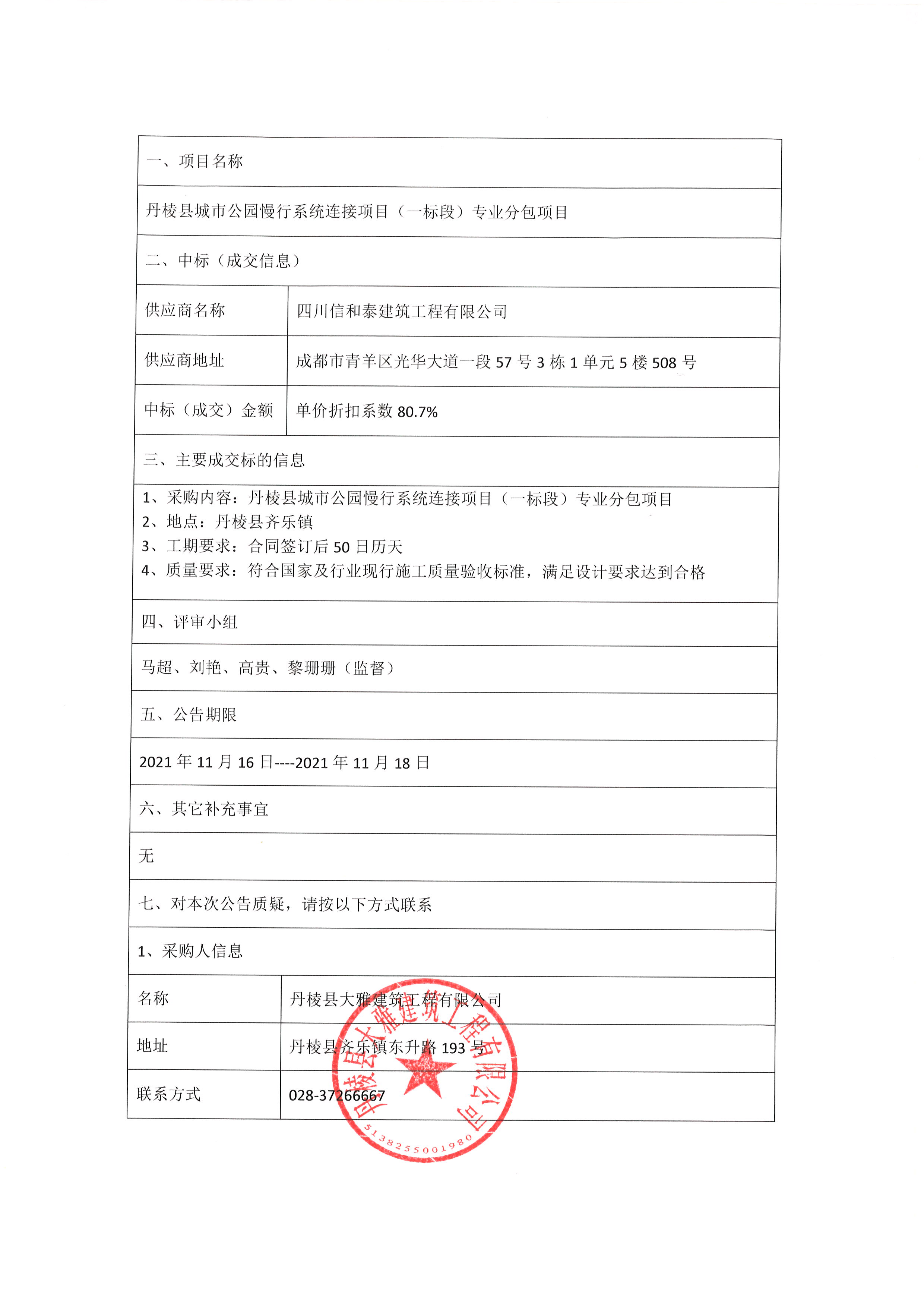 【大雅建筑公司】丹棱縣城市公園慢行系統(tǒng)連接項(xiàng)目(一標(biāo)段)專業(yè)分包項(xiàng)目中標(biāo)公示