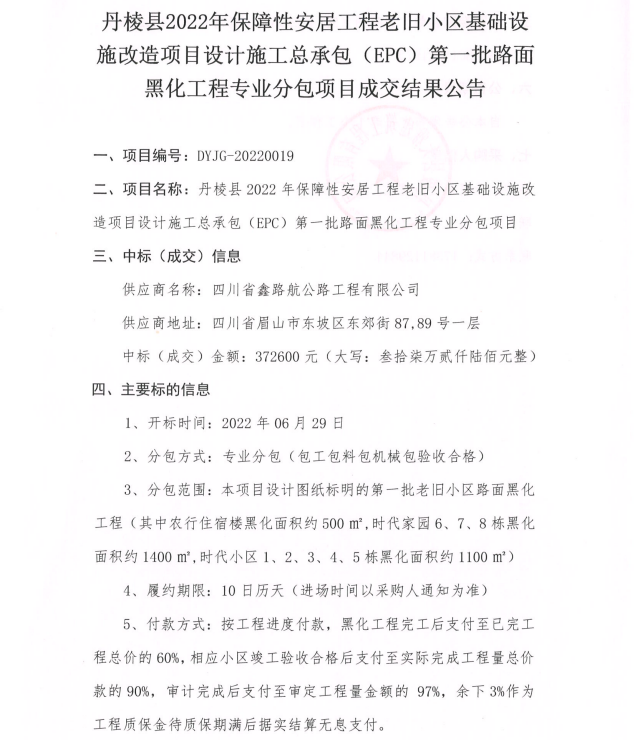 丹棱縣2022年保障性安居工程老舊小區(qū)基礎設施改造項目設計施工總承包(EPC)第一批路面黑化工程專業(yè)分包項目成交結果公告