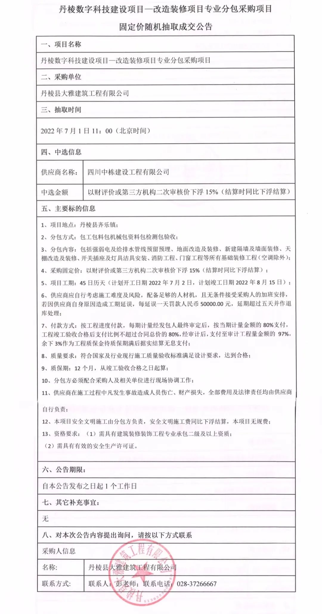 丹棱數(shù)字科技建設(shè)項(xiàng)目--改造裝修項(xiàng)目專(zhuān)業(yè)分包采購(gòu)項(xiàng)目固定價(jià)隨機(jī)抽取成交公告