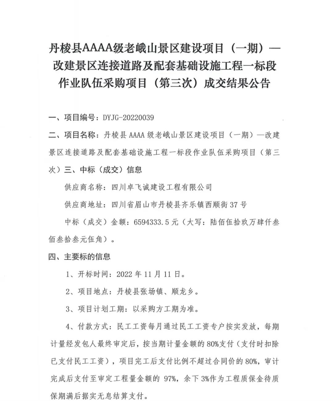 丹棱縣AAAA級(jí)老峨山景區(qū)建設(shè)項(xiàng)目 (一期)-改建景區(qū)連接道路及配套基礎(chǔ)設(shè)施工程一標(biāo)段作業(yè)隊(duì)伍采購(gòu)項(xiàng)目 (第三次) 成交結(jié)果公告