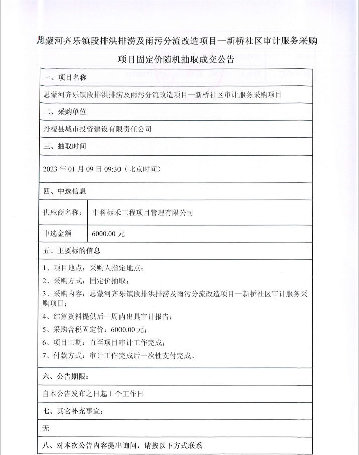 思蒙河齊樂鎮(zhèn)段排洪排澇及雨污分流改造項(xiàng)目--新橋社區(qū)審計(jì)服務(wù)采購(gòu)項(xiàng)目固定價(jià)隨機(jī)抽取成交公告