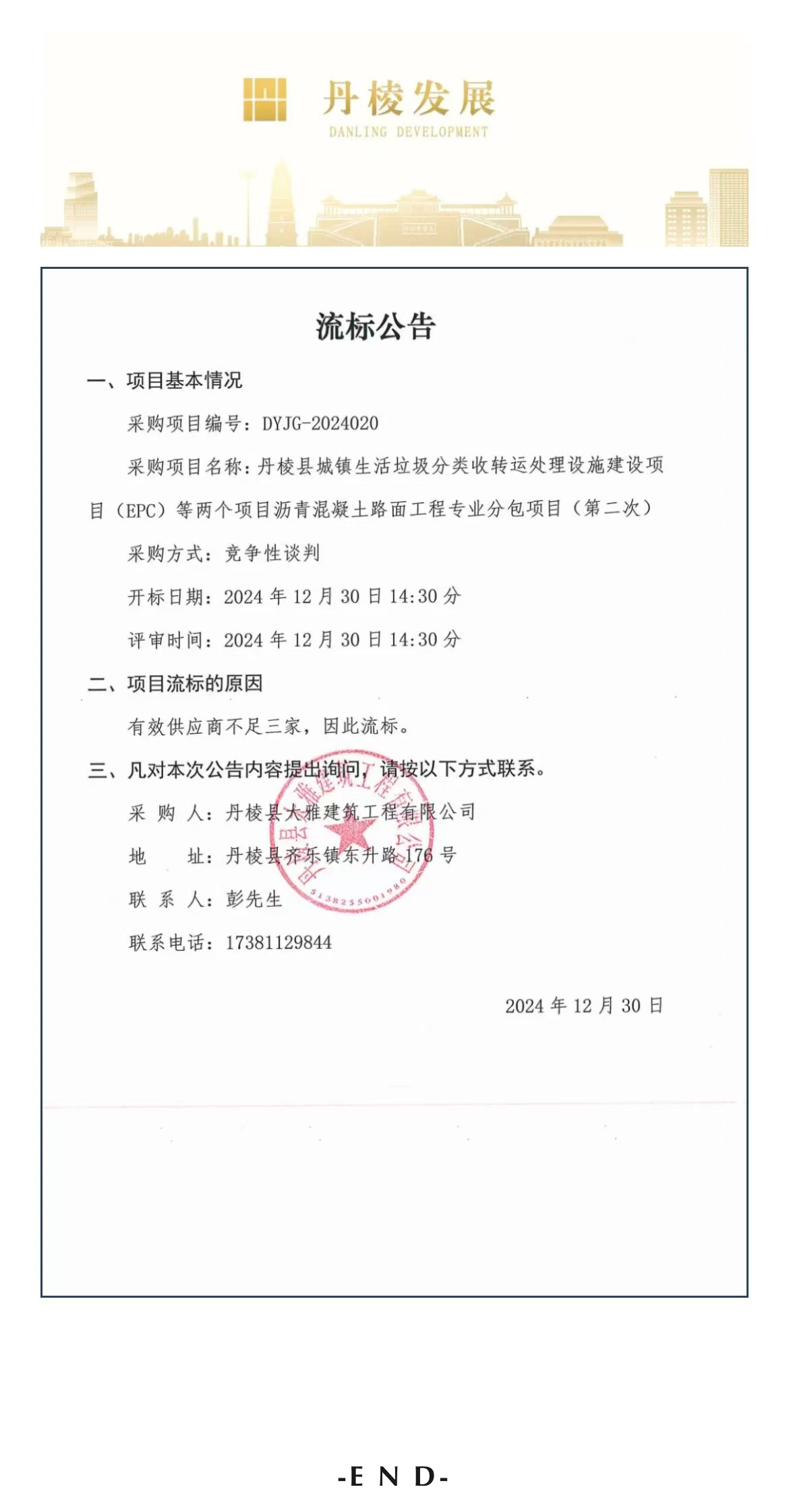 丹棱縣城鎮(zhèn)生活垃圾分類(lèi)收轉(zhuǎn)運(yùn)處理設(shè)施建設(shè)項(xiàng)目(EPC)等兩個(gè)項(xiàng)目瀝青混凝土路面工程專(zhuān)業(yè)分包項(xiàng)目(第二次)流標(biāo)公告