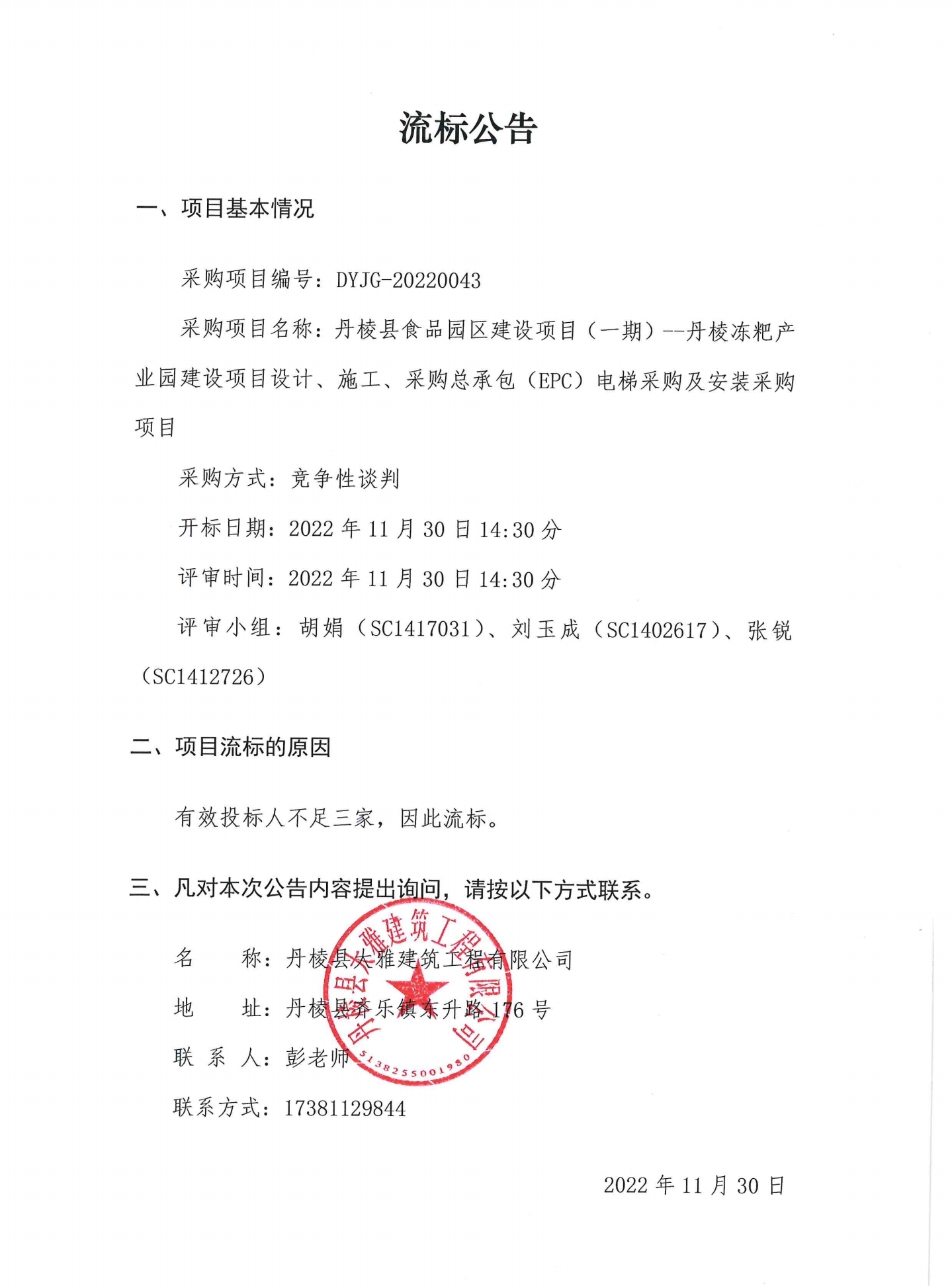 丹棱縣食品園區(qū)建設(shè)項(xiàng)目 (一期)--丹棱凍粑產(chǎn)業(yè)園建設(shè)項(xiàng)目設(shè)計(jì)、施工、采購總承包 (EPC) 電梯采購及安裝采購項(xiàng)目流標(biāo)公告