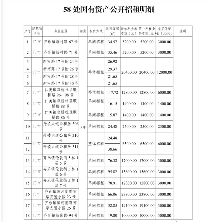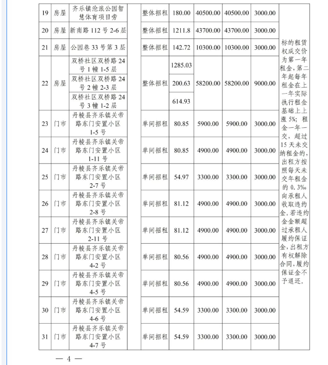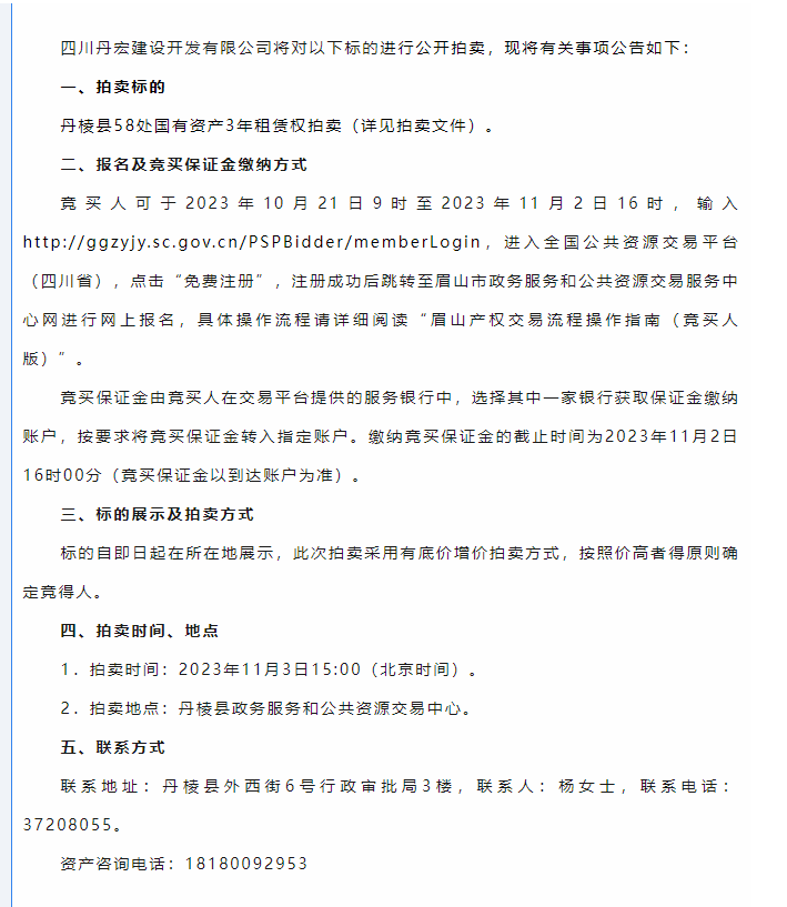 丹棱縣58處國(guó)有資產(chǎn)3年租賃權(quán)拍賣公告