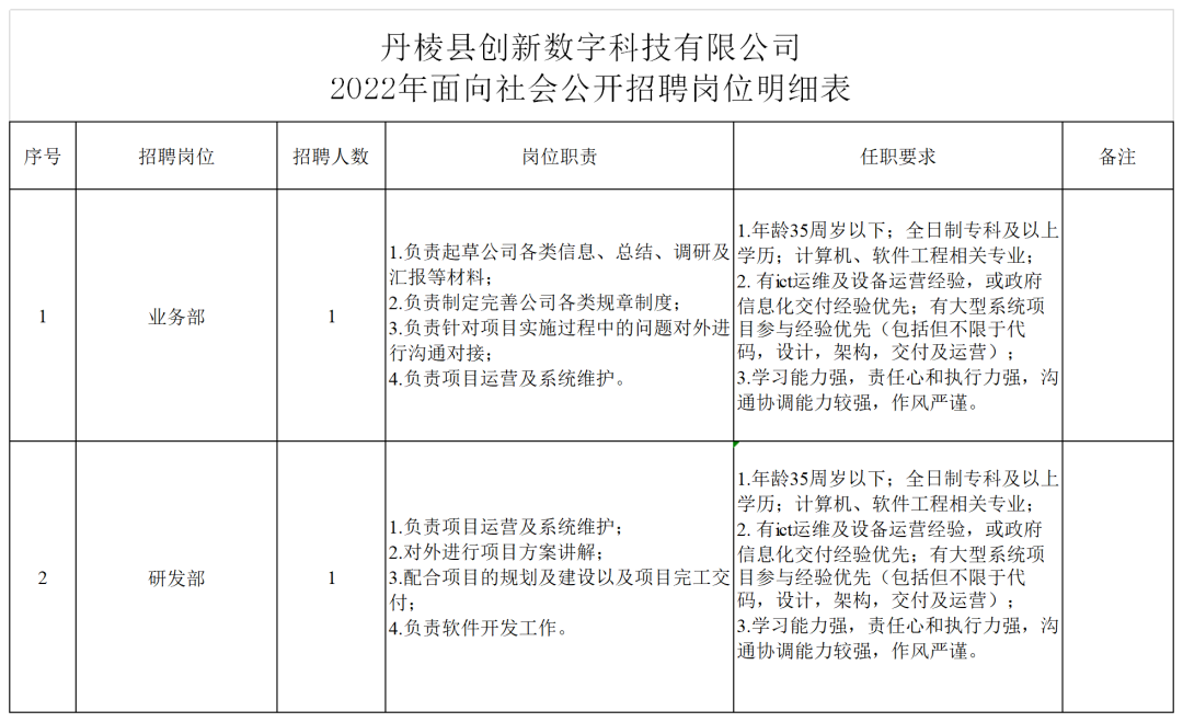 招聘崗位的學(xué)歷、專業(yè)、資歷、年齡等資格條件詳見附件《丹棱縣創(chuàng)新數(shù)字科技有限公司2022年面向社會(huì)公開招聘崗位明細(xì)表》。